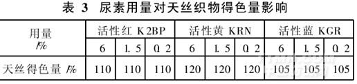 活性染料印花中,尿素起幫助染料溶解,在汽蒸時(shí)使纖維溶脹膨化,提高得色量的作用。將尿素用量增加5%后在天絲織物上刮樣,以常規(guī)工藝刮樣作標(biāo)準(zhǔn)(100%)進(jìn)行比較,結(jié)果見表3。