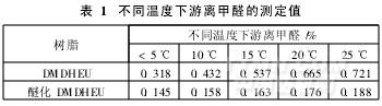 低甲醛樹(shù)脂的生產(chǎn)過(guò)程一般分兩步,第一步先用甲醛、乙二醛和脲反應(yīng)生成DMDHEU樹(shù)脂;第二步將DMDHEU樹(shù)脂與多元醇醚化生成低甲醛樹(shù)脂。以上兩步中,甲醛與酰胺生成羥甲基的化學(xué)反應(yīng)是可逆的,因而無(wú)論是否進(jìn)行醚化,樹(shù)脂中始終會(huì)有一部分游離甲醛存在。用鹽酸進(jìn)行分析滴定時(shí),當(dāng)樹(shù)脂溶液中的游離甲醛與亞硫酸鈉反應(yīng)消耗后,羥甲基化合物還會(huì)水解釋放出一定量的甲醛。溫度對(duì)羥甲基化合物的水解反應(yīng)影響很大,表1是在溫度5~30℃范圍內(nèi)測(cè)出的同一樹(shù)脂樣品的游離甲醛值。