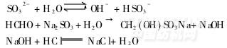 亞硫酸鈉易水解,會(huì)使其水溶液的pH值升高,因此需要先用稀鹽酸溶液調(diào)節(jié)pH值至9. 6。加入待測(cè)的甲醛樹(shù)脂溶液后,溶液中的甲醛與過(guò)量的亞硫酸鈉發(fā)生加成反應(yīng),生成甲醛的加成物和氫氧化鈉;生成的氫氧化鈉再用標(biāo)準(zhǔn)鹽酸溶液滴定pH值至9. 6為終點(diǎn)。其反應(yīng)式如下: