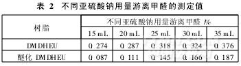 用不同亞硫酸鈉用量測(cè)定的游離甲醛值見(jiàn)表2。當(dāng)12. 5%的亞硫酸鈉用量低于25 mL時(shí),甲醛與亞硫酸鈉的加成反應(yīng)進(jìn)行得不充分,生成的氫氧化鈉量少,測(cè)定值偏低。反之,當(dāng)亞硫酸鈉用量大于25 mL時(shí),過(guò)量的亞硫酸鈉水解產(chǎn)生的氫氧化鈉需要更多的鹽酸來(lái)中和,因而測(cè)定值偏高。亞硫酸鈉用量越大,偏差越大。因此,樹(shù)脂中游離甲醛量低于1 %時(shí), 12. 5 %亞硫酸鈉用量取25 mL為宜。