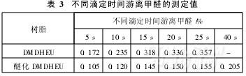 表3是采用不同滴定時(shí)間測(cè)定的游離甲醛值。低溫條件下,甲醛與亞硫酸鈉發(fā)生加成反應(yīng),生成的甲醛加成物及氫氧化鈉的反應(yīng)需要一定時(shí)間才能完成。若滴定時(shí)間太快,低于15s,甲醛與亞硫酸鈉加成反應(yīng)不充分,生成的氫氧化鈉少,導(dǎo)致游離甲醛的測(cè)定值偏低。反之,如果滴定時(shí)間較長(zhǎng),超過(guò)15s,當(dāng)溶液中游離甲醛都反應(yīng)消耗之后,樹(shù)脂中部分羥甲基也會(huì)水解釋放出一部分甲醛。釋放出的甲醛繼續(xù)與過(guò)量亞硫酸鈉反應(yīng)生成氫氧化鈉,需要更多的鹽酸才能使pH值降至9. 6,因此,測(cè)定的游離甲醛量必然偏高。為此,在滴定溫度不超過(guò)5℃條件下,滴定時(shí)間取15s為宜。