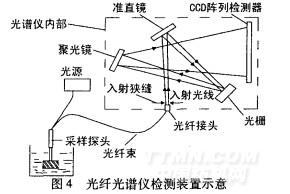 近年來(lái),由于光纖技術(shù)和光電檢測(cè)技術(shù)的發(fā)展,出現(xiàn)了以光纖探頭和CCD陣列檢測(cè)器(也稱(chēng)PDA)結(jié)構(gòu)的光纖光譜儀【10-11】。這種新型的分光光度計(jì)將采樣探頭直接插入染浴中,光從探頭前側(cè)的鏡面反射到CCD陣列檢測(cè)器,從而實(shí)時(shí)監(jiān)測(cè)染浴中吸光度的變化情況,這給在線(xiàn)監(jiān)測(cè)技術(shù)的應(yīng)用帶來(lái)了強(qiáng)有力的手段【12】 。圖4是光纖光譜儀檢測(cè)裝置示意