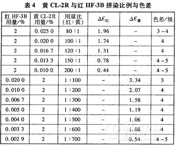 選擇染料用量為2%,再按不同比例加入少量其它染料進行拼混染色;將拼混染樣與主要單色染樣進行對比,測定各自色差。以允許色差為指標,評判兩個染料拼混時(以黃CL-2R與紅HF。3B拼混為例),需要測定的用量和濃度比例范圍,結(jié)果見表4。