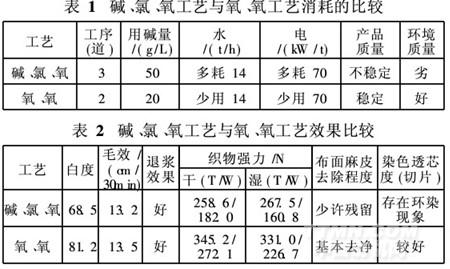 新工藝比原工藝少了一組氯漂工序,而產(chǎn)品質(zhì)量達(dá)到或超過傳統(tǒng)的堿→氯→氧工藝。采用此工藝比較安全穩(wěn)定,操作也較簡(jiǎn)單。針對(duì)不同質(zhì)量織物的處方變化不大,除增減DK-2外,其它的組分無需變動(dòng)。