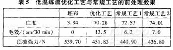 對比低溫練漂優(yōu)化工藝與常規(guī)工藝對棉針織物的前處理效果,結(jié)果見表5。