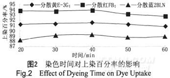 從圖2可以看出,3條曲線均比較平緩,說明保溫染色30min后,保溫時(shí)間的延長對3只染料的上染百分率影響不大。在染色時(shí)間為40min時(shí),染料基本達(dá)到上染平衡值,因而選擇40min為染色保溫時(shí)間。
