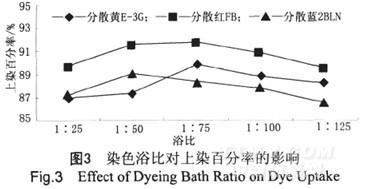 染色浴比對染色效果也有影響,浴比小會(huì)使織物染色不勻,浴比大又會(huì)耗能耗水。用1%的分散黃E-3G、分散紅FB和分散藍(lán)2BLN,在115℃,pH5~6,浴比為1∶25、1∶50、1∶75、1∶100、1∶125條件下對竹炭/吸濕排汗混紡針織物染色40min,其染色浴比對上染百分率的影響如圖3所示。