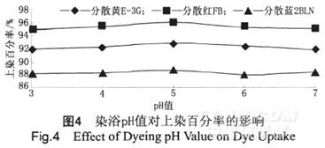 分散染料對染浴的酸堿度穩(wěn)定性也不同。用1%的分散黃E-3G、分散紅FB和分散藍(lán)2BLN,在115℃、浴比1∶75、pH3~7條件下對竹炭/吸濕排汗混紡針織物染色40min,其結(jié)果如圖4所示。