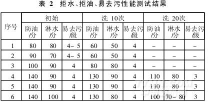 2.1拒水、拒油、易去污性能測(cè)試(見表2)