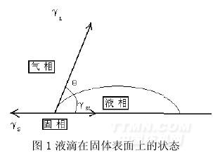 Young 提出了著名的楊氏方程,楊氏方程建立了液體在固體表面形成的接觸角θ和界面張力之間的關(guān)系,界面張力指的是固體同氣體之間、液體和氣體之間以及固體和液體之間的張力。