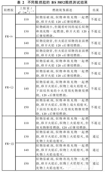 (3)經(jīng)FR-Ⅲ阻燃膠涂層的試樣,涂層膜很容易燒破,在上膠量達(dá)130 g/m2(干重)時(shí),織物沿著破洞處邊燃燒邊向周圍卷起,填充物也有燒著現(xiàn)象。但移開(kāi)火源后,織物和填充物上的火焰馬上熄滅,故被認(rèn)定為能通過(guò)BS 5852阻燃測(cè)試。