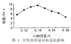在反相乳液聚合時(shí),水相粒子內(nèi)存在的丙烯酸、銨鹽和MBAM,被水油相界面的AIBN引發(fā)自由基反應(yīng)而聚合。由于MBAM的交聯(lián)作用,生成的聚合物使線型的COO-基形成網(wǎng)絡(luò)結(jié)構(gòu)。在聚合工藝條件及處方不變的前提下,改變引發(fā)劑AIBN的用量,得到圖1所示的結(jié)果。