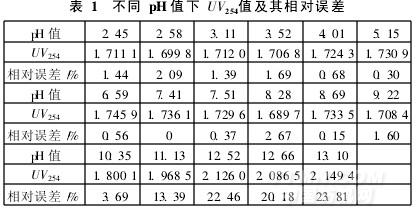 將同一水樣等分成若干份,分別用硫酸或氫氧化鈉調(diào)節(jié)pH值,然后測定其UV254值(見表1)。表1中,pH值為2.45~9.22,UV254變化不大; pH>10時,UV254顯著增大。這主要是由于pH值不同,有機(jī)物的顯色基團(tuán)會發(fā)生變化。因此,不同廢水的UV254隨pH值的變化規(guī)律是不一樣的。以pH值為7.41時的UV254為基準(zhǔn),計算各pH值下UV254的相對誤差,結(jié)果見表1。