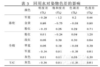 不同水質(zhì)在實(shí)際使用中引起的色差是否符合質(zhì)量要求,也是關(guān)鍵。因此考察了回用水對(duì)色差的影響,結(jié)果見(jiàn)表3。