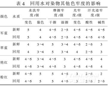 在染整過(guò)程中,水中的部分物質(zhì)可能殘留在織物中,這些殘留物可能會(huì)與染料作用,影響到染物的各種牢度。經(jīng)過(guò)深度處理的回用水對(duì)織物各種牢度的影響程度的實(shí)驗(yàn)結(jié)果如表4所示。