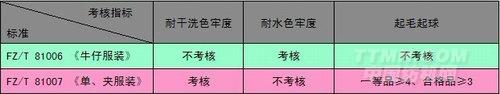 2、《牛仔服裝》,適用于以純棉、棉纖維為主混紡、交織的色織牛仔布為主要原料生產(chǎn)的普通及彩色牛仔服裝?!秵巍A服裝》,適用于以棉、麻、 絲、化纖及其混紡織物等為原料,成批生產(chǎn)的單、夾服裝。這兩個(gè)標(biāo)準(zhǔn)是有一些交集的,例如一件傳統(tǒng)梭織普通牛仔布加工的服裝成品可以選擇《牛仔服裝》標(biāo)準(zhǔn)測(cè) 試,也可選擇《單、夾服裝》標(biāo)準(zhǔn)。通過(guò)表二可以發(fā)現(xiàn),這兩項(xiàng)標(biāo)準(zhǔn)的考核指標(biāo)有很多不同。《牛仔服裝》不考核干洗尺寸變化率,《單、夾服裝》需要考核。而 “耐水色牢度”指標(biāo),《牛仔服裝》中要考核,《單、夾服裝》不考核。那為什么說(shuō)這些呢,就拿“起毛起球”這項(xiàng)指標(biāo)來(lái)說(shuō),《單、夾服裝》標(biāo)準(zhǔn)中明確規(guī)定,優(yōu) 等品、一等品起毛起球允許程度≥4、合格品起毛起球允許程度≥