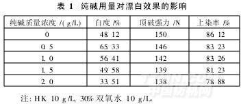 由于腈綸基牛奶蛋白纖維織物不耐堿,在較高的堿劑濃度下易變黃,而H2O2/HK體系需要在一定堿性條件下才能發(fā)揮出漂白效果,因此,堿劑用量是H2O2/HK漂白的一個(gè)重要的工藝因素。試驗(yàn)選用純堿作為堿劑,分別為在0,0.5,1.0,1.5,2.0g/L的用量下進(jìn)行漂白,結(jié)果如表1所示。