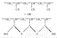 當(dāng)純堿用量在0.5g/L時(shí),白度達(dá)到最高。再提高純堿用量,能產(chǎn)生漂白有效組分的量增加,但是白度卻呈下降趨勢,這是因?yàn)榕D痰鞍桌w維中聚丙烯腈在堿性條件下會發(fā)生水解,相鄰的丙烯腈結(jié)構(gòu)單元之間發(fā)生環(huán)化反應(yīng),形成含CN鍵的共軛結(jié)構(gòu)。這種共軛結(jié)構(gòu)能夠吸收可見光而使織物泛黃[5],反應(yīng)如下所示[4]: