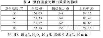 考慮到本試驗采用低溫漂白(80℃以下)工藝,因此,選定50,60,70,80℃四個溫度點進行漂白,結(jié)果如表4所示。