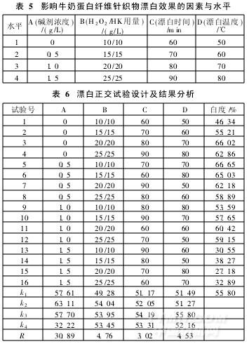 為了進一步分析漂白加工中各因素對漂白效果的綜合影響,分別選取堿劑濃度、漂白溫度、漂白時間和H2O2/HK用量進行L16(44)的正交試驗。鑒于漂白后織物的頂破強力及染料上染率雖有不同程度的下降,但都能符合織物的服用性能,因此在正交試驗過程中只把漂后白度作為衡量指標。其因素水平設計見表5,結(jié)果分析見表6。