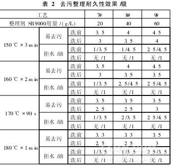 試驗了不同易去污整理劑用量和不同焙烘條件下的拒水拒油和易去污效果,以及10次工業(yè)水洗后的耐久性,如表2所示。