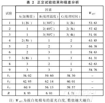 采用L9 (33)正交設(shè)計(jì),進(jìn)行了加酶量、處理溫度和處理時(shí)間的3因素3水平正交試驗(yàn),以確定最佳配比,從而得到最經(jīng)濟(jì)有效的處理工藝。其試驗(yàn)設(shè)計(jì)及分析結(jié)果見表2。