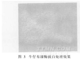 3.2 采用拔染劑JN、檸檬酸、糊料、網(wǎng)印粘合劑、涂料為主要組分的拔染處理色漿,在靛藍(lán)牛仔成衣上經(jīng)印花、預(yù)烘干、150℃壓燙20 s、水洗、皂煮和烘干,可獲得理想的色拔效果。