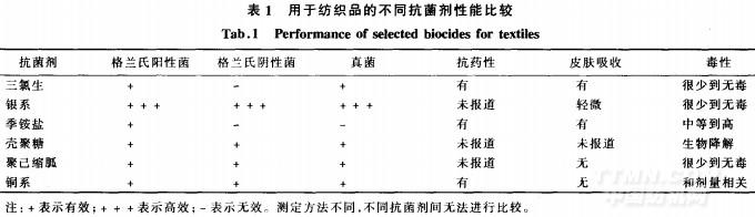 微量的、相對無毒的金屬具有殺滅病原體和防止它們增殖的“微量作用效應(yīng)”。在所有金屬中,銀最具微量生物活性。銀的使用最早可以追溯到l8世紀使用硝酸銀治療胃潰瘍[1 ]。l9世紀第1次確定了銀離子的抗菌活性,到了20世紀20年代,膠體銀由于可以有效地處理傷口而被美國食品藥品署(FDA)認可[2-3]。與其他抗菌劑相比,銀系抗菌劑具有抗菌性能高(見表1),不易產(chǎn)生抗藥性的特點,具有很高的安全性。在溫暖潮濕的環(huán)境里,銀離子具有非常高的生物抗菌活性。同時,銀系抗菌劑還具有很多優(yōu)點,如對皮膚沒有刺激性,不影響紡織品的服用性能,因此銀系抗菌劑適合于抗菌功能紡織品的制備[4-5]