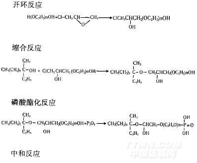本精練劑的合成分為開環(huán)反應(yīng)、縮合反應(yīng)、磷酸酯化、中和反應(yīng)四步,各步反應(yīng)如下:
