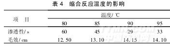 由表4可以看出,縮合反應溫度為90℃時所合成的試劑滲透性和毛效均較好,故選擇縮合反應溫度為90℃。