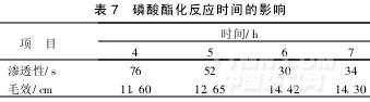 由表7可以看出,磷酸酯化反應時間為6 h,所合成的試劑滲透性和毛效均較好,故選擇磷酸酯化反應時間為6 h。