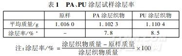 由表1知,聚丙烯酸酯涂層染色滌棉混紡織物的涂層率為7.8%,聚氨酯涂層染色滌棉混紡織物的涂層率為8.5%。