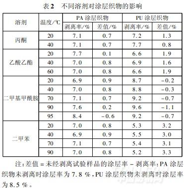 由表2知,用丙酮20°C低溫剝離時(shí),對(duì)PA涂層織物和PU涂層織物可獲得基本一致的剝離率;升高溫度到40°C剝離時(shí),PA涂層織物無變化,而PU涂層織物則剝離程度稍有增加。不同溫度下乙酸乙酯對(duì)涂層劑的剝離影響不大。通過比較可知,乙酸乙酯對(duì)PA涂層織物的剝離效果優(yōu)于PU涂層織物的剝離效果;不同溫度下二甲基甲酰胺對(duì)涂層劑的剝離影響較為顯著,隨著溫度的升高,PA涂層織物和PU涂層織物的剝離率均呈增加趨勢;不同溫度下二甲苯對(duì)兩種涂層劑的剝離率均無顯著影響,該溶劑對(duì)聚丙烯酸酯的剝離效果優(yōu)于對(duì)聚氨酯的剝離效果。