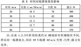 使用精練漂白劑NF-1在95℃對(duì)莫代爾/棉混紡針織物練漂不同時(shí)間,效果見(jiàn)表3。