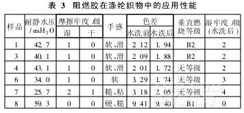 在阻燃涂層膠中,加有交聯(lián)劑封閉性聚氨酯,其在焙烘過程中會釋放出—NCO,與活性氫發(fā)生交聯(lián)反應,提高涂層膠交聯(lián)度、涂層牢度和耐水性(表3)。