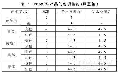 表7 PPS纖維產(chǎn)品的各項性能(藏藍色)