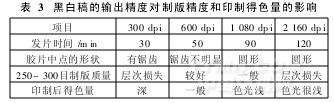 四分色印花黑白稿的輸出精度將直接影響后道制版精度和印制的得色量。比較輸出精度300dpi、600dpi、1080dpi、2160dpi等工藝試驗(yàn),得出表3的數(shù)據(jù)(以80mm×130mm膠片為例)。