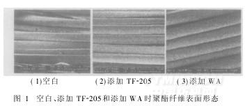 分別將低聚物去除劑WA和TF-2205與勻染劑同浴使用,同時(shí)做空白試驗(yàn)(染浴中不加低聚物去除劑)。染色后用掃描電鏡觀察纖維表面低聚物分布情況,結(jié)果如圖1所示: