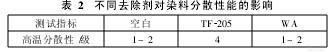 低聚物去除劑TF-2205能明顯抑制低聚物向聚酯纖維表面遷移,從而大大減少纖維表面的低聚物;它可與染色助劑同浴使用,對織物得色沒有影響;低聚物去除劑中的酯類組分與纖維有很好的結(jié)合力,附著在纖維表面,使纖維獲得滑爽柔軟的手感;還能明顯提高染料的高溫分散性,減輕色點和對染缸的沾污,市場前景良好。