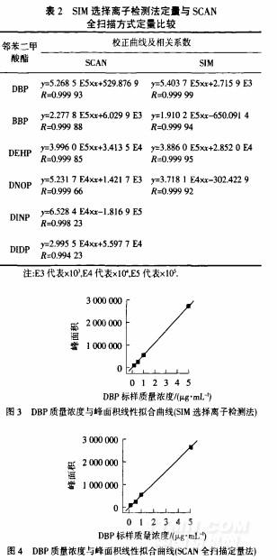 從圖3和圖4可以看出,經(jīng)過多級(jí)校正得到的標(biāo)準(zhǔn)曲線呈很好的線性關(guān)系,保證了在相應(yīng)線性范圍內(nèi)進(jìn)行定量分析時(shí)數(shù)據(jù)的準(zhǔn)確性.同時(shí),經(jīng)過sIM選擇離子檢測(cè)法定量與SCAN全掃描方式定量的比較,可以確證用SIM選擇離子檢測(cè)法定量得到的相應(yīng)信號(hào)峰面積更大,線性相關(guān)系數(shù)更好.為此建議:在日常檢測(cè)中,用SIM選擇離子檢測(cè)法來對(duì)鄰苯二甲酸酯進(jìn)行定量分析.