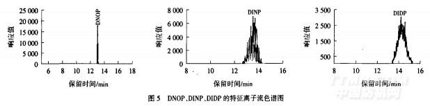 在應(yīng)用GC—MS法同時(shí)測(cè)定6種鄰苯二甲酸酯含量過程中。發(fā)現(xiàn)增塑劑DINP、DIDP定量有一定的特殊性.從圖2的色譜圖可以看到,增塑劑中的DBP、BBP、DEHP色譜峰分離比較完全,可以很準(zhǔn)確地根據(jù)特征離子的峰面積進(jìn)行定量分析.但DINP、DIDP兩種鄰苯二甲酸酯類增塑劑有大量的同分異構(gòu)體存在,沸點(diǎn)較高,沸程也較寬,在試驗(yàn)中無論采取如何優(yōu)化分離方法都不能得到單一的色譜峰,而是一組色譜峰群,且兩者的色譜峰有部分重合,得到的峰信號(hào)相應(yīng)也較其他4種低.另外,DNOP的沸點(diǎn)介于DINP、DIDP兩種鄰苯二甲酸酯之間,出峰時(shí)間與DINP、DIDP重疊,很難用SIM選擇離子檢測(cè)法,同時(shí)測(cè)定6種鄰苯二甲酸酯的含量,也大大影響了測(cè)定的準(zhǔn)確度.通過觀察6種鄰苯二甲酸酯的質(zhì)譜圖,發(fā)現(xiàn)由于它們的結(jié)構(gòu)相似。質(zhì)譜碎片相似,標(biāo)準(zhǔn)中提到的DNOP、DINP、DIDP3種鄰苯二甲酸酯的定量離子279、293、307雖然不是靈敏度最高的質(zhì)譜碎片,但都具有一定特征性的碎片,用這些離子提取色譜峰可以排除其他峰的干擾.因此,在定量中只有通過SCAN全掃描方式得到總離子流圖,然后提取相應(yīng)的特征離子峰279、293、307才能進(jìn)行準(zhǔn)確地定量.由表2中相應(yīng)數(shù)據(jù)可以得出,通過這種方法定量,三者的線性關(guān)系較好.這三種鄰苯二甲酸酯的特征離子色譜圖見圖5.對(duì)于DINP、DIDP的色譜峰群定量時(shí)可用各自的異構(gòu)體化合物峰面積和進(jìn)行定量.