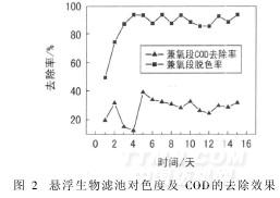 印染廢水的生物脫色主要是在兼氧或厭氧條件下進(jìn)行[9~12],本研究分析了懸浮生物濾池在兼氧條件下對(duì)模擬印染廢水色度及COD的去除效果。在染料濃度50mg/L和其它營(yíng)養(yǎng)物、微量元素含量不變的條件下,考察了活性艷紫染料廢水的色度及COD變化情況,結(jié)果如圖2所示。