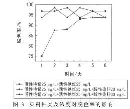 保持其它組分不變,增加進(jìn)水中染料的種類及濃度。圖3給出了三種不同染料廢水的脫色率曲線。