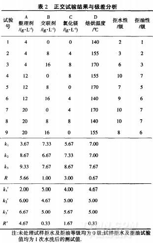 由表2可知,對滌綸織物拒水性能而言,各因素極差由大到小排列為:RA>Rc>RB>RD。對拒油性能為:R,A>R,C>R,B=R,D整理劑FG一410用量是最主要的影響因素,因此,在確定其水平數(shù)時一定要選擇整理效果最佳的水平.選擇A3水平(20g/L)可使整理后滌綸織物拒水拒油等級同時達(dá)到最好;而MgCl2用量是影響整理后滌綸織物拒水拒油等級的次重要因素,選擇C3水平(8g/L)可使整理后滌綸織物拒水拒油等級同時達(dá)到最好;因正交試驗只測試了整理后滌綸織物1次水洗后的拒水拒油性能,尚不能全面反映交聯(lián)劑的作用,所以,交聯(lián)劑用量的最優(yōu)水平通過后續(xù)耐洗性能測試后再確定.焙烘溫度對織物的拒水拒油效果影響較小,結(jié)合拒水拒油整理效果及生產(chǎn)成本,選擇D2水平(155℃).