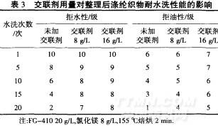 從表3可以看出,隨水洗次數(shù)的增加,未添加交聯(lián)劑整理的織物拒水拒油效果下降很快.而添加交聯(lián)劑整理的織物盡管初始拒水拒油效果與未添加交聯(lián)劑整理的織物基本相同,但耐洗性得到明顯改善.水洗20次后,添加交聯(lián)劑的織物仍可保持較優(yōu)的拒水拒油性能,尤其是交聯(lián)劑用量為16g/L,整理后織物拒水性仍可達(dá)8級,拒油性也可達(dá)5級.原因是交聯(lián)劑兩端的反應(yīng)性基團(tuán)可分別與纖維和整理劑反應(yīng),將纖維與整理劑牢固地結(jié)合起來,在纖維上形成三維網(wǎng)狀結(jié)構(gòu),增加了纖維分子間滑移的摩擦阻力,減少了水洗過程中纖維表面整理劑的洗除.[5]綜合考慮,選擇交聯(lián)劑用量16g/L.