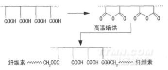 這種酯化反應(yīng)持續(xù)進(jìn)行,可在纖維之間形成三維網(wǎng)狀結(jié)構(gòu)的交聯(lián)。正是這種三維的酯化交聯(lián),使得相鄰的纖維素大分子以共價(jià)鍵相連接,阻止了纖維間的
