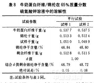 牛奶蛋白纖維/錦綸在65%質(zhì)量分數(shù)硫氫酸鉀溶液中的溶解情況如表8所示。