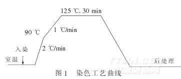 滌綸是一種重要的合成纖維,其優(yōu)點是機械強度高、耐磨、耐酸堿、化學(xué)穩(wěn)定性強、不易霉蛀等[1]。低聚物是滌綸生產(chǎn)過程中對苯二甲酸和乙二醇在縮聚反應(yīng)中形成的低分子量副產(chǎn)物,其平均含量達到1%~3%,大多在纖維內(nèi)部。低聚物具有較高的化學(xué)穩(wěn)定性和熱穩(wěn)定性,易聚集和結(jié)晶。染色過程中,低聚物從滌綸內(nèi)部遷移到纖維表面,引起染料富集于低聚物,而低聚物粘附在纖維表面,會出現(xiàn)染料色點、色花等現(xiàn)象,影響手感、外觀。低聚物沉積在設(shè)備的不同部位,易形成難于去除的污垢,使得織物染色時易產(chǎn)生缸差,同時還限制了正常的液流速度,導(dǎo)致染色不均勻,重現(xiàn)性差。滌綸染深色特別是黑色時,低聚物的影響更為顯著,是染廠中常見的問題。此外,低聚物在織物表面形成“浮色”,對滌綸織物的色牢度有一定的影響。去除低聚物可采用幾種方法:降低染色溫度,清洗設(shè)備,高溫排液,還原清洗和染色助劑等[2]。本文采用不同的工藝處方染色織物,并在相同工藝升溫曲線下探討低聚物去除劑的應(yīng)用效果。