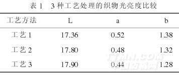 取上述3種工藝處理的織物放在datacolor測色配色儀器下進行測試,比較其光亮度,結(jié)果如表1。