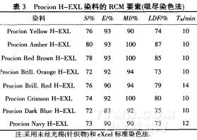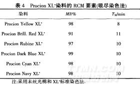 此外,ProcionXL也是一類能使棉織物及其混紡織物實(shí)施一次準(zhǔn)染色的多活性基及脫活的新型活性染料,它的RCM要素如表4所示.